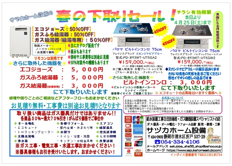 | こんにちは。 ゴールデンウイークが終わり、いよいよ暑くなってくる時期ですね。 サヅカホーム設備では【夏をさきどりセール】として、17日(金)より三保・折戸・駒越地区に新聞折込を入れさせていただきます。 ホームページにも先行してチラシを載せますので、是非ご覧ください。 また静岡市内であればチラシの内容でご対応致しますので、お気軽にご相談ください。ただし、静岡市内でも区域や場所によっては出張料や諸経費をいただくことがありますのであらかじめご了承ください。 |