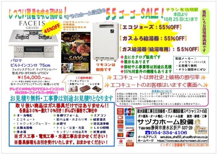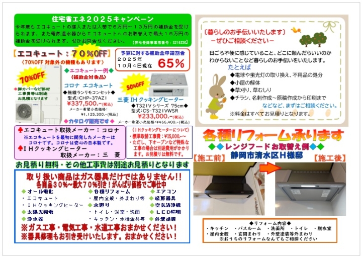 みなさまこんにちは。もう10月だというのにこの暑さ…。少しはしのぎやすくなってきたとはいえ、秋とはいいがたいような気候ですね(;'∀') そんなもやもやした気分を吹き飛ばすチラシが明日の新聞折込に入ります。エコキュートの補助金の使用率が去年よりも早いような気がするので、補助金がなくなってしまわないうちに思い切ったチラシを打ちました。当ホームページには先行して載せましたので、ぜひご覧ください。 |